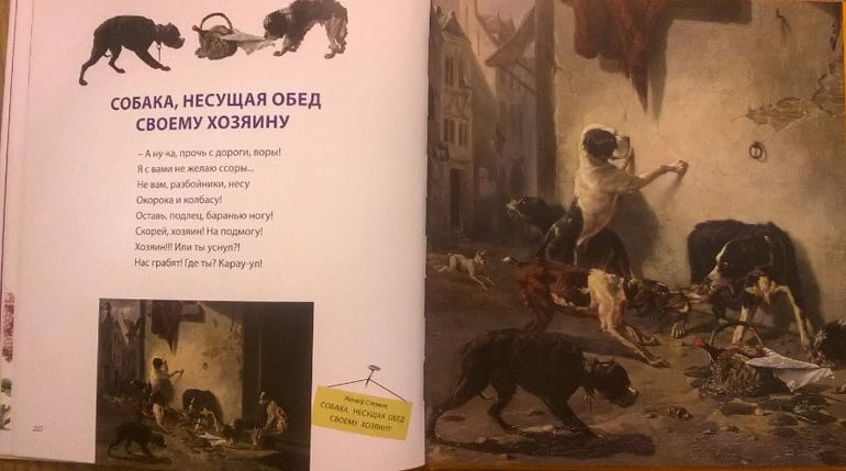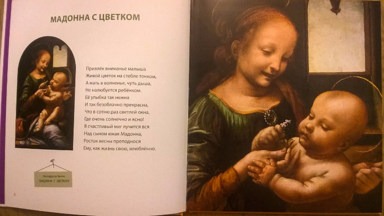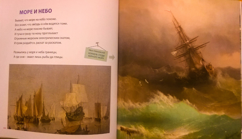 Внутри самый настоящий художественный альбом, только каждое произведение искусства сопровождается стихотворением - коротким или длинным, серьезным или с юмором. Многое поймут дети, а что-то и для взрослых. Почти везде на один разворот - одна картина и стихотворение к ней.