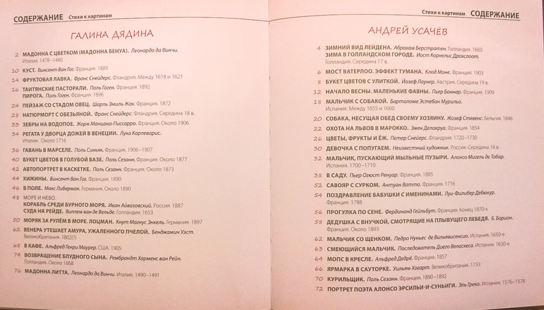 Сама книга удобная, ладная, размер 23х21 см, пухлая обложка, 82 стр., мелованная бумага, отпечатано в Латвии. Стихов одного и другого автора примерно пополам. Всего представлено около 40 картин.