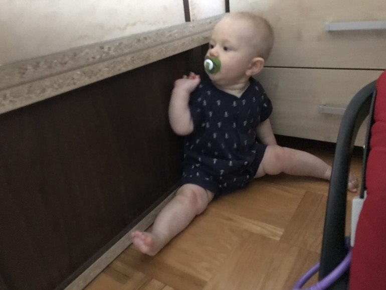 Вчера, 4.09.17 Мишастик сел сам. Ну то есть он по шкафу ручищами помог себе, как я поняла. Я действо пропустила, так как ходила на мол.кухню (смелая и сильная, но больше не пойду сама).