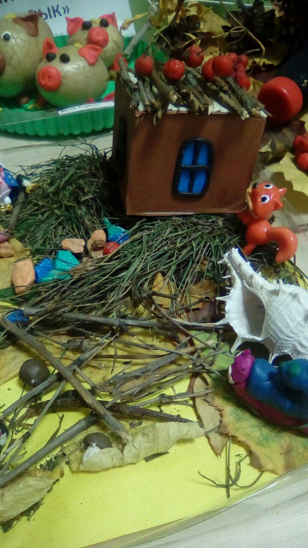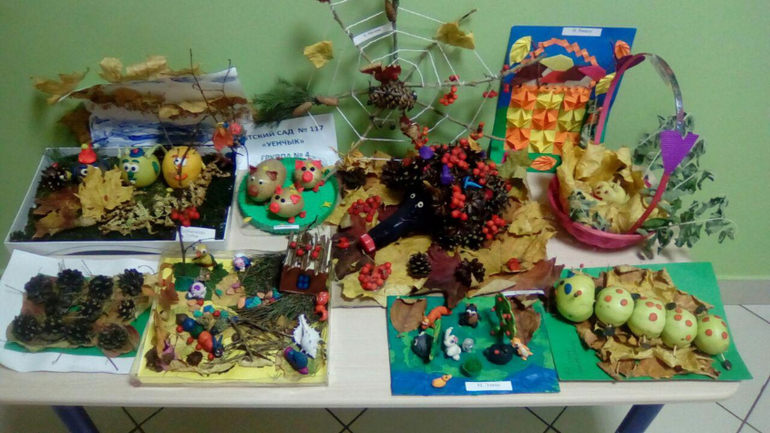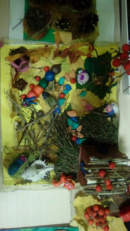 Как уж мы не поучаствуем в этом ) Набрали с Кириллом вечером после садика материалы. Прикольно было. Ребенку нравилось собирать листики, веточки. Мы еще на тот момент не знали, что будем делать. Идея возникла в процессе творения ) Когда собрали материалы и несли их домой, то получился очень красивый осенний букетик с веточками, листиками, ягодками рябины и зелеными стебельками травы. Даже сосед- художник оценил наш осенний букет. Но дома мы решили сделать не букетик, а вот такую картину- поделку. Называется она "Осенние деньки". Кирилл сам лепил (заранее) гусеницу, улитку и птичку. Мы нашли им местечко в нашей поделке. Кирилл остался очень довольный своим трудом. Да и нравится видеть свою поделку на выставке.