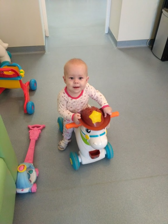 Мы стали бодрее ходить. Появилась у нас штука такая... ходунки-стремянка. Как-то так. Вот держась за нее она может ходить пока в преграду не упертся. Сама ходить боится пока.