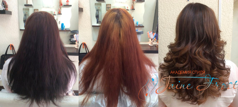 Чтобы выровнять цвет и хоть немного улучшить качество волос, я отменила всех клиентов, которые были записаны после нее, и мы с 11 утра до 19:30 вечера спасали и приводили в порядок волосы. На каждом этапе выравнивания цвета я использовала все известные мне методики восстановления волос, чтобы не травмировать еще больше их.