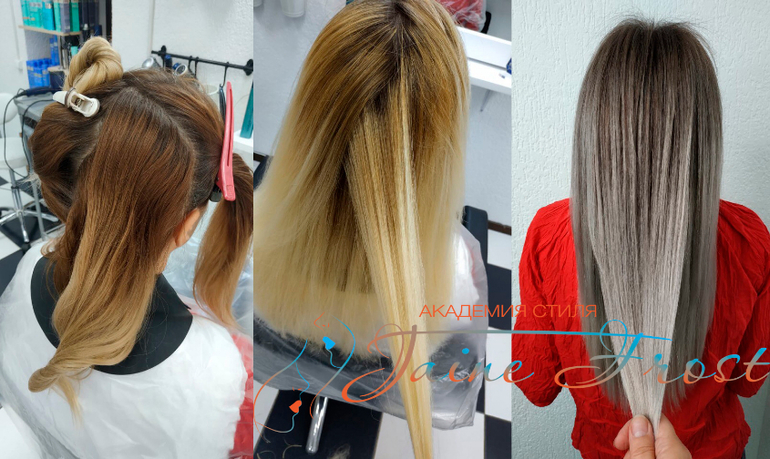 Год назад мы делали полное осветление волос, а далее мы просто окрашивали прикорневую зону и тонировали полотно.