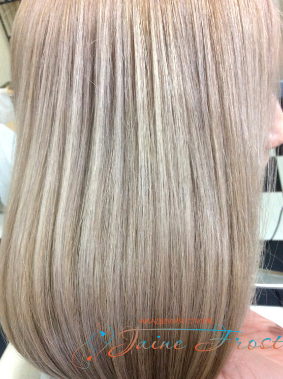 Данная работа выполнена с помощью красителя из осветляющей серии, что позволило нам добиться прекрасного, ровного бежевого блонда без желтизны и прочих ненужных нюансов.