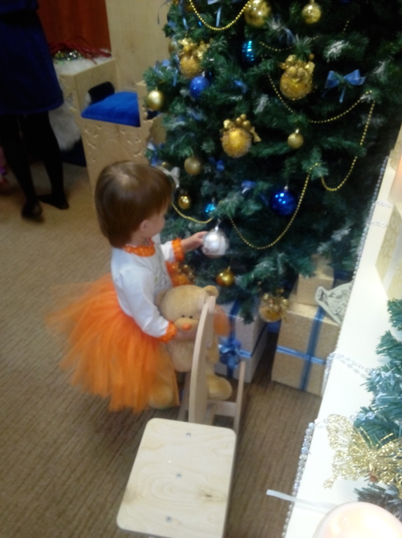Первый раз мы посетили новогодний утренник! Доченька практически не участвовала в процессе, но с удовольствием разглядывала елочку и кралась в закулисье;)