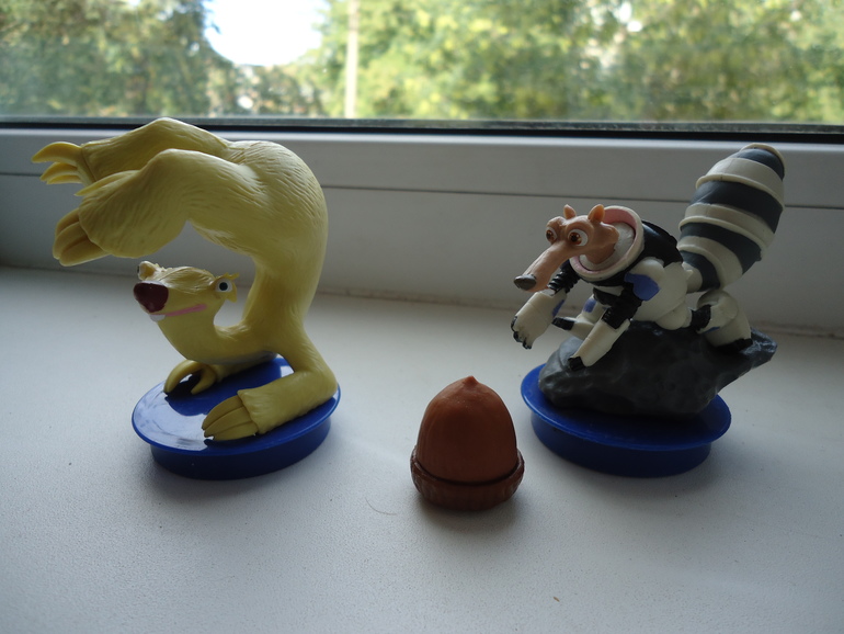 Деткам купили в Блинной по подарку-домику, внутри сок, блин с ветчиной и сыром и игрушка на выбор из Ледникового периода. Взяли ленивца и белку. Клевые игрухи )