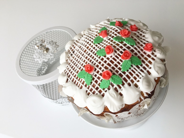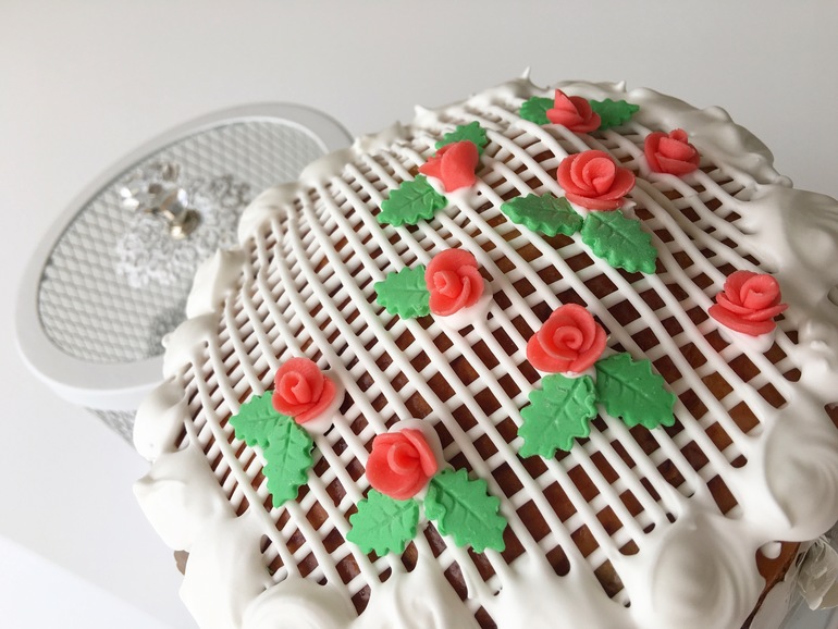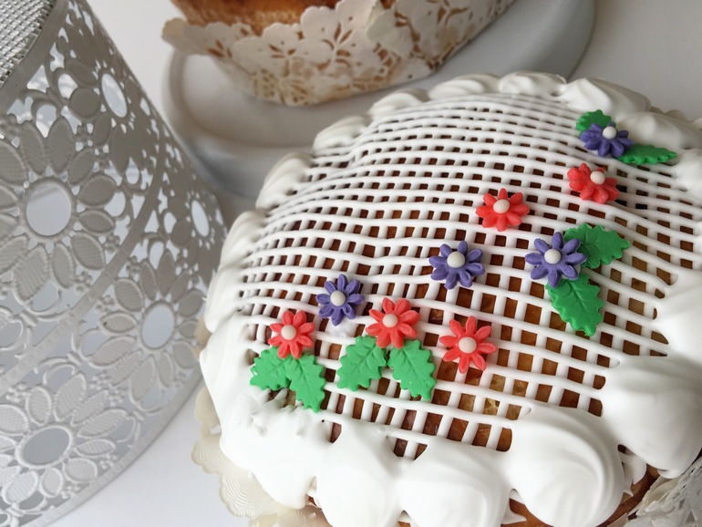 Остывшие куличи украсить решеткой из айсинга. Один белок взбить с 300 граммами сахарной пудры и одной столовой ложкой лимонного сока.