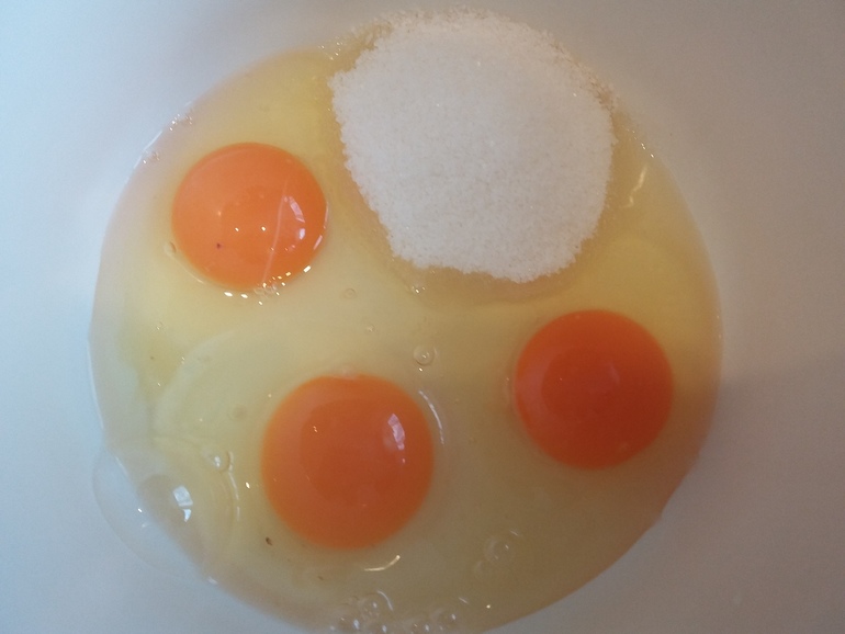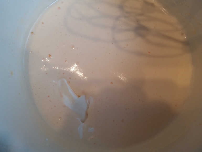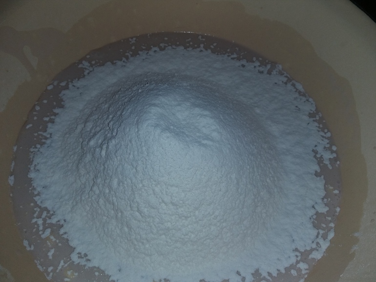 Размешать веселкой, добавить 3 стакана просеянной муки: