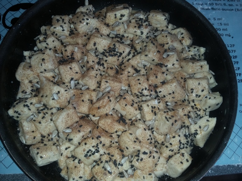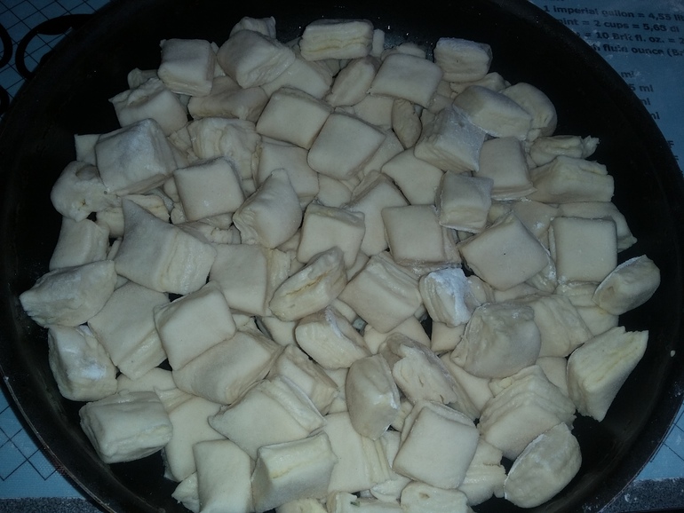 Нарезать на кубики с гранью 1,5-2 см (зависит от толщины получившегося пирога):