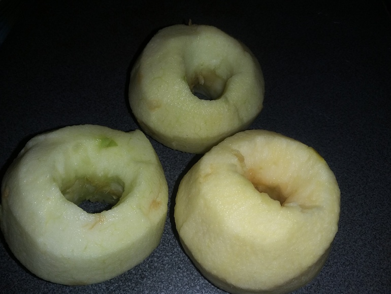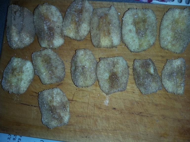 Нарезать яблоки на четвертинки, сбрызнуть лимонным соком, обвалять в сахаре с пряностями: