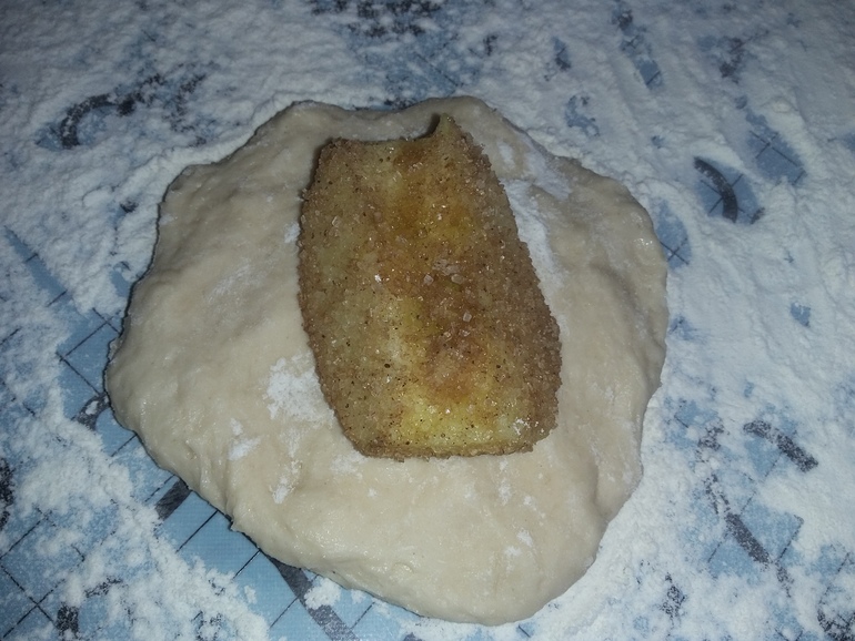 Из подошедшего теста отделить кусочки размером с крупное яйцо. Размять руками в лепешку, положить яблоко: