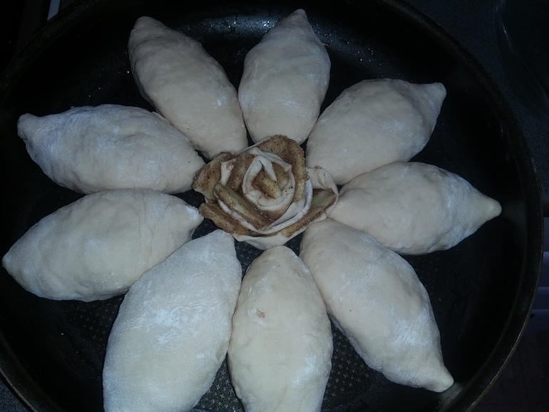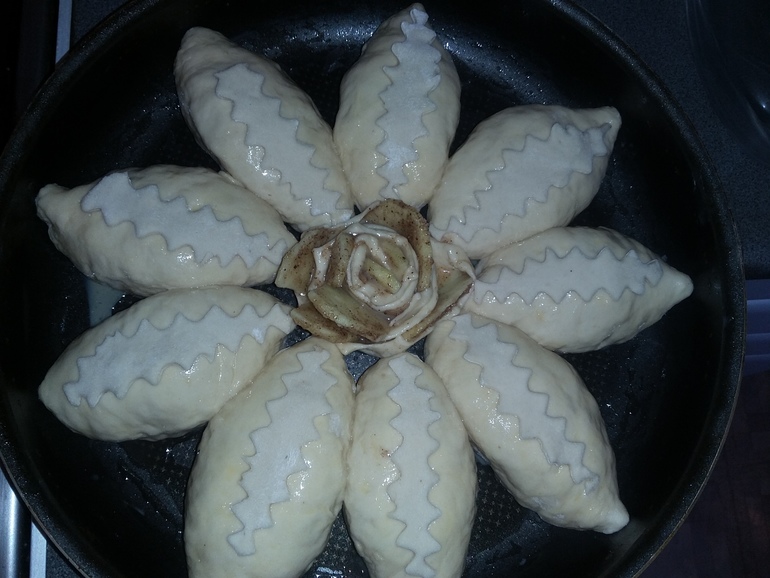 Защипать пирожок, положить в форму, смазанную маслом. Сделать из пирожков цветок, украсить середину: