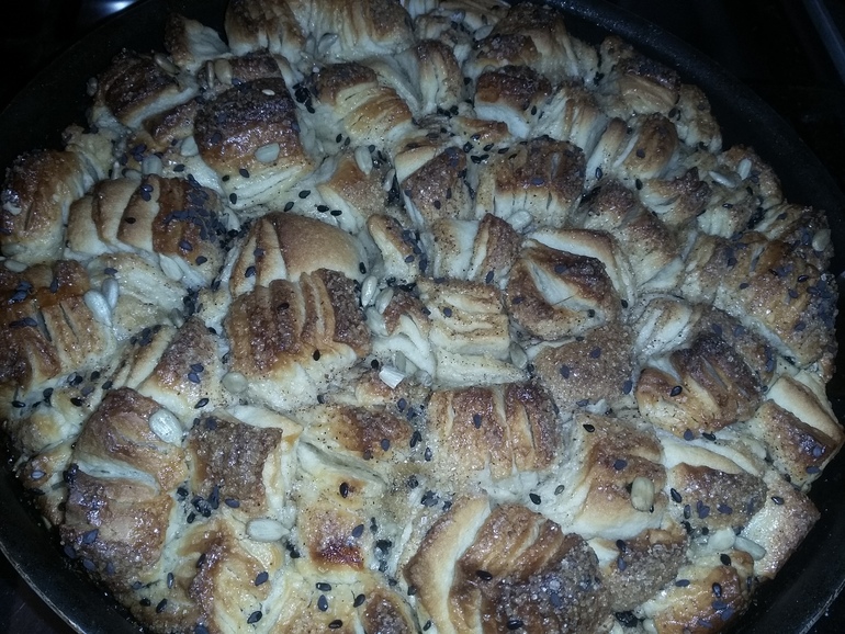 Смазать пирог яйцом, посыпать сезамом, кунжутом, семечками, коричневым сахаром: