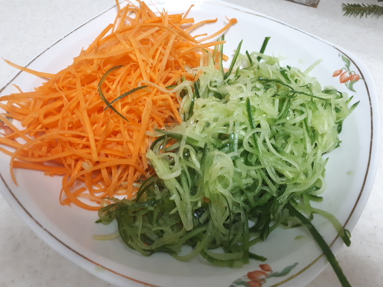Натереть огурец и морковь соломкой