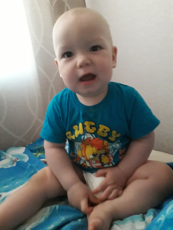 Ходит вдоль дивана, ползает со скоростью света, обнимает собаку, целует нас открытым слюнявым ротиком.