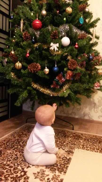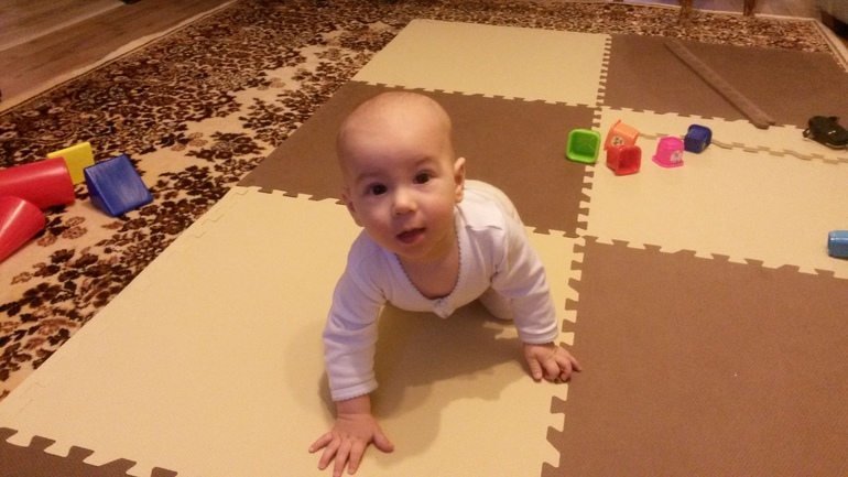 Какой взрослый, смешной, интересный человек! Ползает по всему дому, только пятки сверкают, сидит уверенно, встает везде, держится у опоры одной рукой, ходит немного вдоль опоры, стоит на коленках без опоры, лепечет и болтает, с интересом все разглядывает и изучает, отличает своих и чужих, отличает еду от всего остального, и очень любит маму