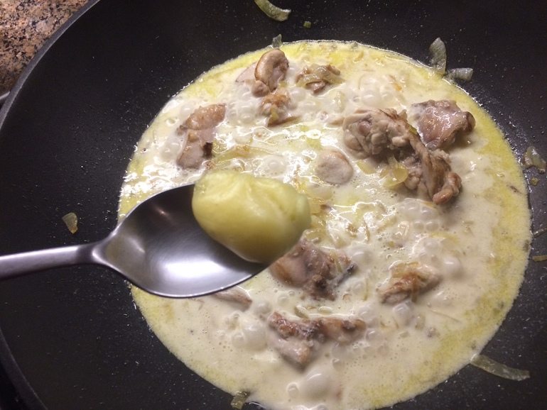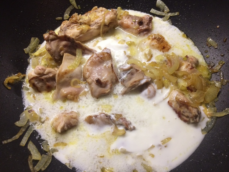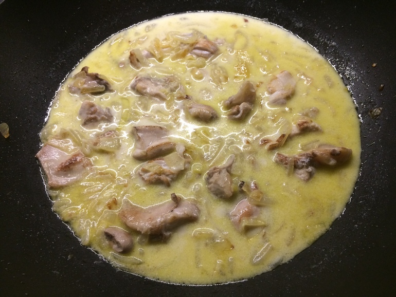 6. В сметану добавляем соль и воду, чтобы сметана стала жидкой и вливаем в сковороду.
