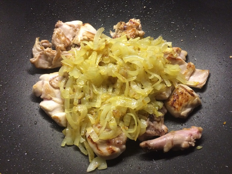 2. Обжариваем на масле лук (порезан полукольцами) до золотистого цвета. Убираем из ВОКа.
