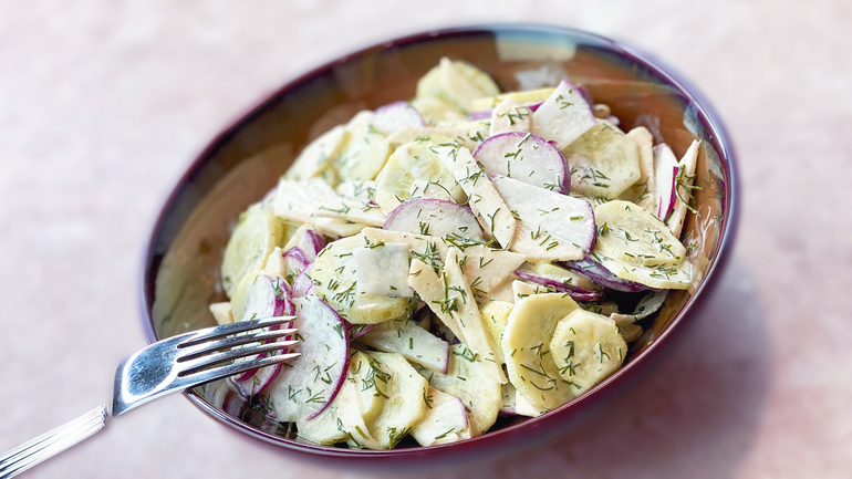 Весенний Салат из редиски, огурцов и яблока со сметаной