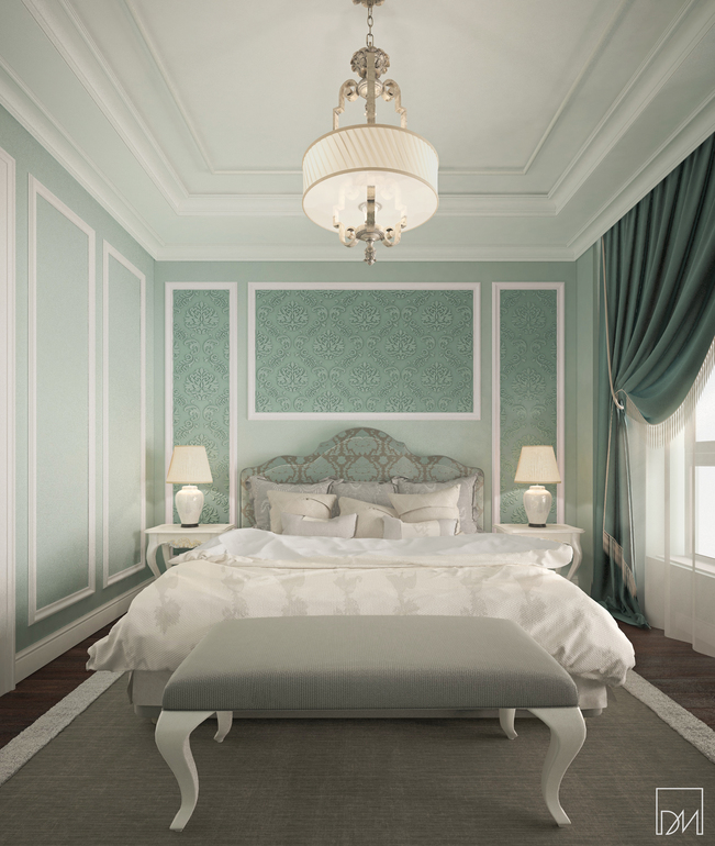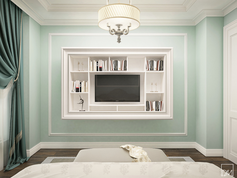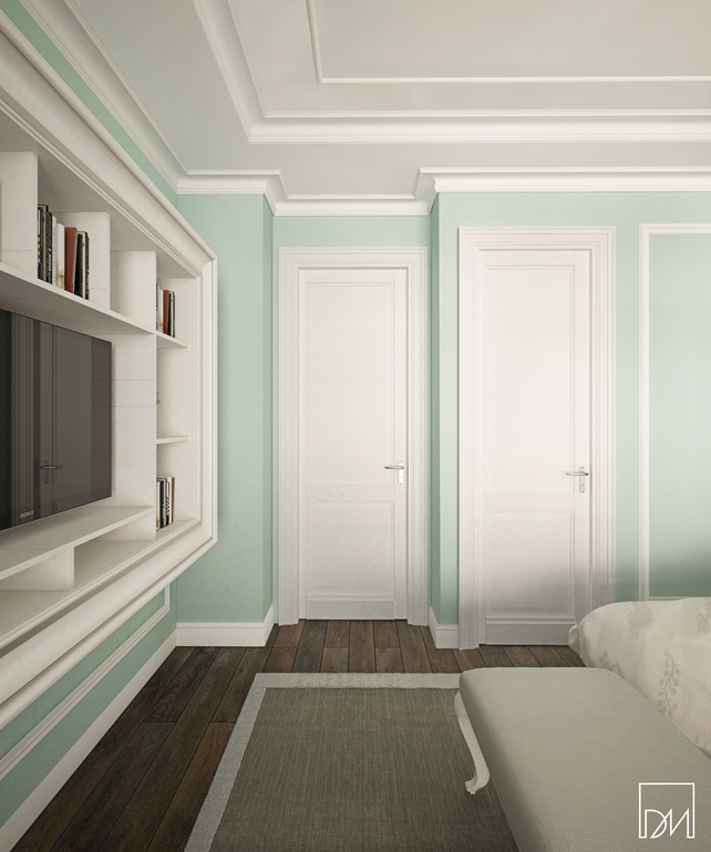 Благодаря постельным тонам помещение как - будто пронизано светом, а многоуровневый потолок с широкими карнизами дает все то же ощущение простора.