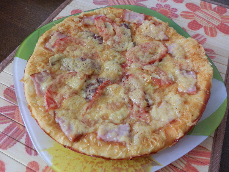 В теплое молоко (250 мл) (НЕ горячее!!!) добавляем дрожжи (7-10 грамм это 2 чайные ложки) + сахар (2 ч.л.). Даем минут 15 войти в реакцию! Тем временем вилочкой взбиваем 2 яйца, соль (0,5 ч.л.) и подсолнечное масло (5 ст.л.) до однородной массы (не сильно) и добавляем в подошедшие дрожжи. Просеиваем муку (500-550 гр это чуть неполная литровая банка). В муке делаем углубление и добавляем туда дрожжи с яйцами. Замешиваем тесто. Как говорит моя мама дрожжевое тесто не должно липнуть к рукам, поэтому в случае необходимости добавляем муку (тесто я вымешиваю руками, предварительно смазав их подсолнечным маслом). Накрываем полотенцем и оставляем на 1 час в теплом месте (для этого я включаю духовку на 100 градусов и рядом ставлю миску с тестом). Пока подходит тесто, готовим начинку. В этот раз у меня: балык, остатки московской колбасы, сыр российский, шампиньоны стерилизованные резанные, помидоры, кетчуп томатный (начинка может быть самая разнообразная, ведь вся фишка в тесте). Все нарезаем тонкими ломтиками, сыр трем на мелкой терке. Берем тесто раскатываем в тонкий пласт толщиной 3-4 мм. выкладываем в форму, смазанную растительным маслом. Тесто смазываем кетчупом и выкладываем начинку. Я люблю пиццу тонкую, как в пиццериях, а не домашний пирог с толстым слоем начинки из всего, что есть в холодильнике)))) На любителя в общем. Ставим нашу пиццу в духовку, разогретую до 180 градусов и выпекаем в течение 20-25 минут, тут важно не пересушить, поэтому строго придерживаемся этих параметров. Приятного аппетита Вам и Вашим домочадцам, которых за уши от пиццы не оторвать!!!