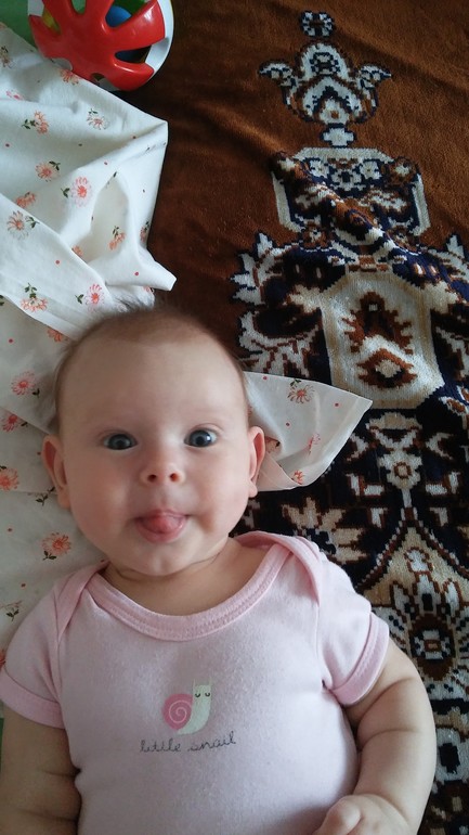 Девчонки,привет!Нам 3 месяца уже и 5 дней)))весим 5600 и рост 60 см)))Маме любим улыбаться)Особенно,когда покушаем,ляжем на титю и как давай разговаривать)))Соску не берет!Слезок так и нет...К окулисту пойдем в субботу.К неврологу талонов нет.Стала реже подмывать и шершавость на ножках проходит.Хотим уже встать!!!Качаем пресс!!!Делаемся как лодочка и качаемся))))Аж иногда личико краснеет от усилия)))Игрушки держим и сразу в рот тянем!Еще не очень переворачиваемся!!!Было пару раз что перевернулась...Думаю и надеюсь скоро начнем!Ложимся спать поздно в районе 00-2...А я уже привыкла)))Ночью кушаем)))В районе 4 потом в 7,в 9...с 9 до 11-12 гуляем и потом спим до 15))))Ну а дальше как попало)))Пару раз было при выкладывании на пузико потянулось к погремушке...но это всего пару раз)))
