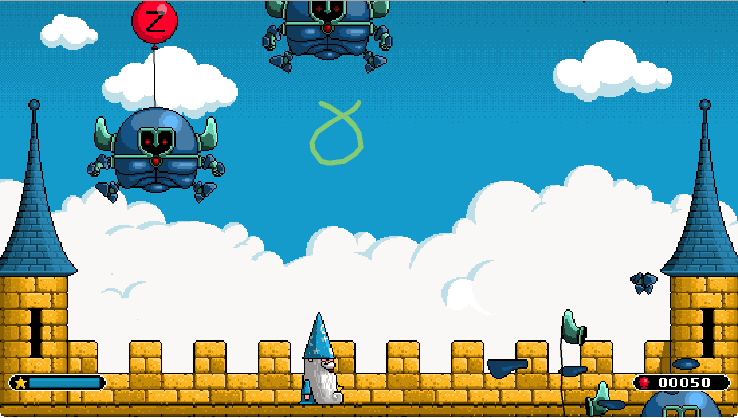 По мини сюжету игры, нам предстоит играть за седого волшебника, на замок которого с небес спускаются инопланетные роботы. В качестве парашютов, они используют обыкновенные воздушные шарики ) Нам предстоит помочь нашему волшебнику рисовать магические символы, которые должны совпадать с изображениями, нарисованными на шарах. Если вы начертили правильный символ, это означает что заклинание сработало, и тогда шарик робота лопается, и робот падает на землю и разбивается.