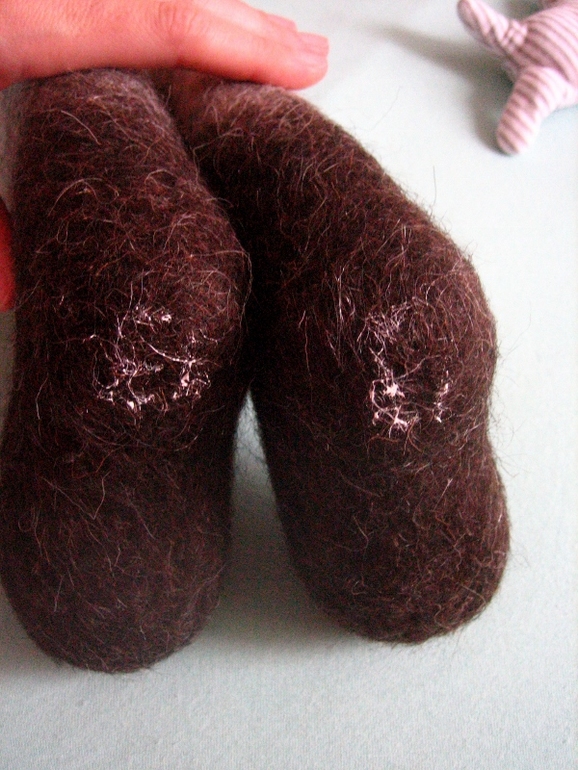 Клей на пяточках меня "порадовал"(( Пахнут не шерстью - а клеем пва. Интересно, они действительно валяные? Может, их на клею собирают?