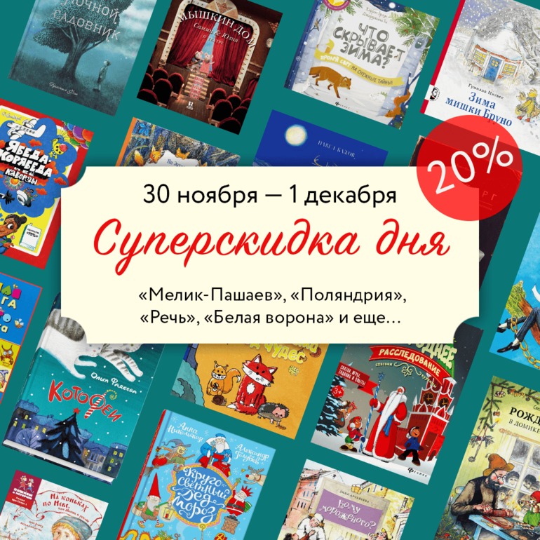 C полудня 30 ноября по 1 декабря на 4000 интересных детских книг действует скидка 20%. Участвуют: «Белая ворона», «Мелик-Пашаев», «Речь», «Проф-пресс», «Поляндрия», «Пешком в историю», «Фома», «Настя и Никита», «Феникс-Премьер».
