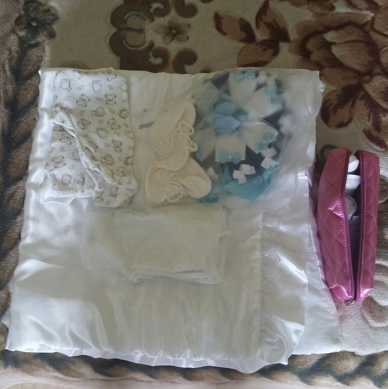 Сумка №3 на выписку. Тут я правда еще не очень подготовилась... себе не знаю что взять... А малышу пока приготовила конверт с бантом, слипик с шапочкой тонкий, и толстый, и вот еще думаю может комбез взять... хотя тетя связала в конверт одеяло шерстяное... не знаю не решила пока что...подумаю об этом в ближайшую неделю=)