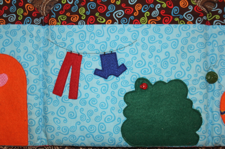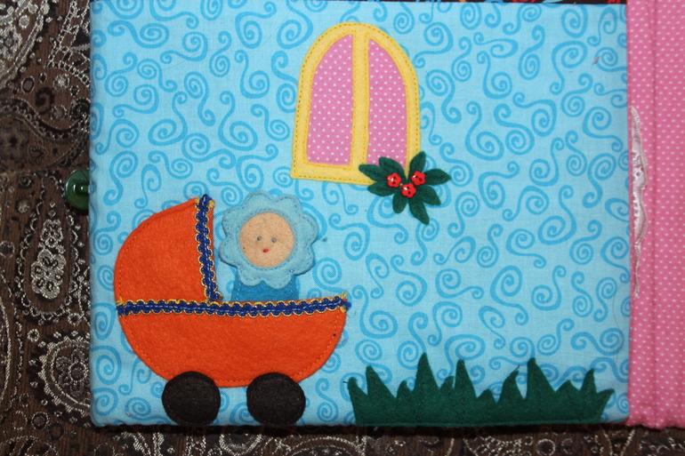 Домик жесткий, но гибкий. С обеих сторон внутри тонкий слой поролона, чтобы домик был мягкий, и его приятно было держать в руках. Сперва ещё был картон, но он быстро заломался, и мне пришла в голову мысль сделать "скелет" из пластиковых папок. Теперь ему и вода не страшна. Ткань - остатки американского хлопка для пэчворка. Декор и куколки из фетра + декоративные пуговки в форме цветочков и букашек. Я бы, конечно, могла написать, что некоторые детали специально криво пришиты, чтобы было понятно, что это handmade. Но, на самом деле, я криворучка нетерпеливая - скорее хотела закончить.