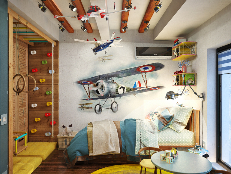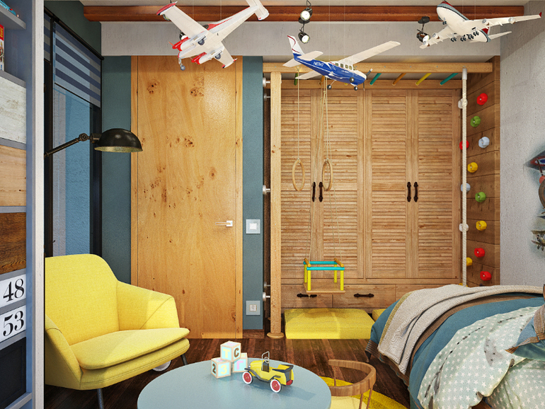 Очень яркая в цветовом отношении, насыщенная деталями, рисунками детская комната выполнена в современном стиле. Основная тематика: самолеты и еще раз самолеты, - юный хозяин комнаты их очень любит. Помимо спальной зоны отлично вписалась и игровая зона в виде спортивного уголка, и система хранения.