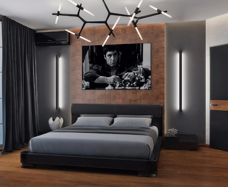 Сдержанность, изысканная простота и нештампованность современного стиля, который идет в ногу со временем - отличительные черты этого интерьера спальни в квартире Краснодара. Акцентом является геометричность форм и контрастное цветовое решение, которое объединяет всю квартиру: теплый деревянный оттенок отлично сочетается и оттеняет холодную как сталь мебель и отделку стен. Минимум декора не перегружают интерьер - достаточно ультрамодной люстры и большой черно-белой фотографии на стене.