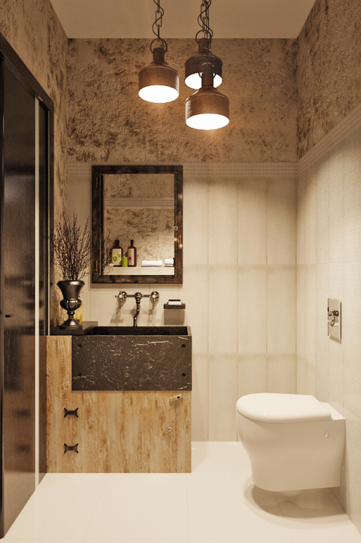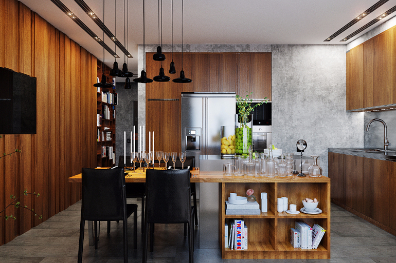 Натуральные материалы в интерьере - это главное. В этом проекте дерево играет главную роль. Для контраста мы использовали холодную сталь - такое сочетание материалов делает интерьер необычнее и ярче. Интерьер носит минималистский мужской характер, поэтому и лаконичный стиль мебели продиктован стилем комнаты. Важная деталь для холостяка дополняет кухню - вместительный винный шкаф.
