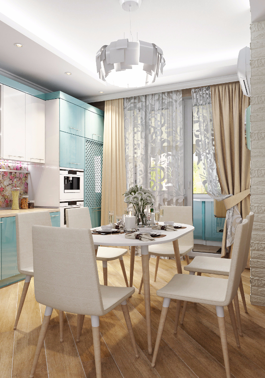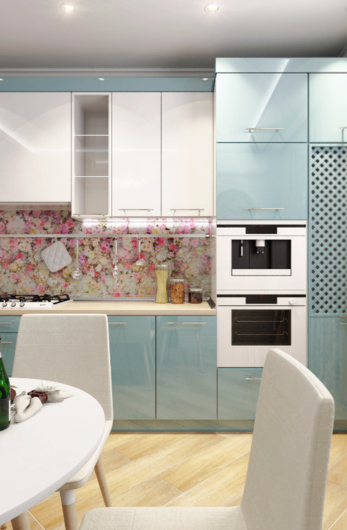 Очень легкая, по-весеннему украшенная кухня в современном стиле будет радовать наших заказчиков в Севастополе. Ощущение чистоты и свежести создают сочетание белого, кремового и небесно-голубого цветов. Оригинальности и живости придаёт цветочный фартук рабочей зоны кухни, а так же контрастное противопоставление фактур в материалах: с одной стороны - гладкая поверхность кухонного мебельного консоля, и с другой стороны - естественная шершавость кирпичной стены. А особую домашнюю атмосферу приносят с собой любимые семейные фотографии на стене.