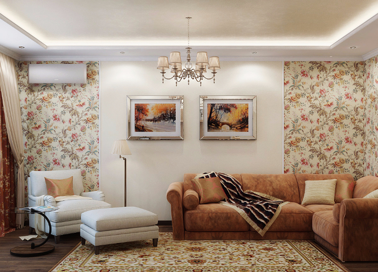 Гостиная спокойна по своему колориту - от бежевого до терракотового, с обилием цветочного принта. Она слегка напоминает нам классику, но не перестает быть современной, о чем свидетельствует нам геометричный консоль под большой телевизор, занимающая одну из стен.
