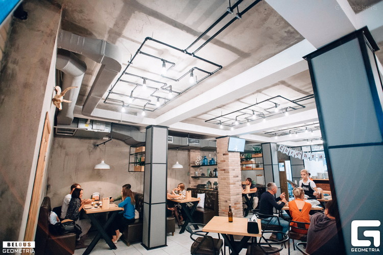 Белый потолок выполнен с помощью декоративного покрытия - "белый бетон". А также имеет декоративные элементы балок.