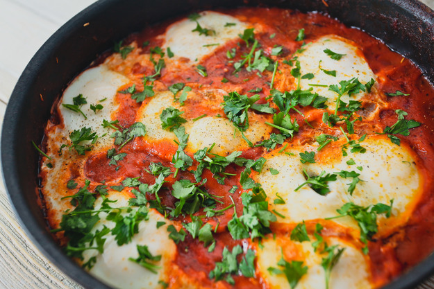 Порезать мелко лук и чеснок. Перец нарезать небольшими кубиками. Разогреть на сковороде масло и затем обжарить на нем лук и чеснок до золотистого цвета. Добавить перец и еще не много обжарить. Добавить томаты, специи, и зелень. И тушить помешивая около 5-7 мин. Сделать небольшие углубления и в них выбить яйца. Посолить и готовить пока белок не станет белым, а желток внутри еще останется жидким.Перед подачей посыпать петрушкой. Подавать со свежим хлебом или питой.