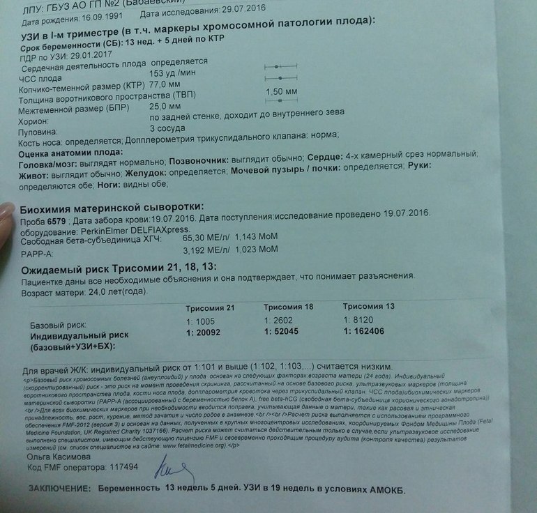 а еще прилагаю результаты скрининга... у нас определают только количество рук ног, а пальчики не считают, и длину кости носовой тоже не определяли... Но главное, что малыш здоров, все у него на месте, и уровень рисков в норме. Ах да! Срок поставили на 5 дней больше, чем по месячным...