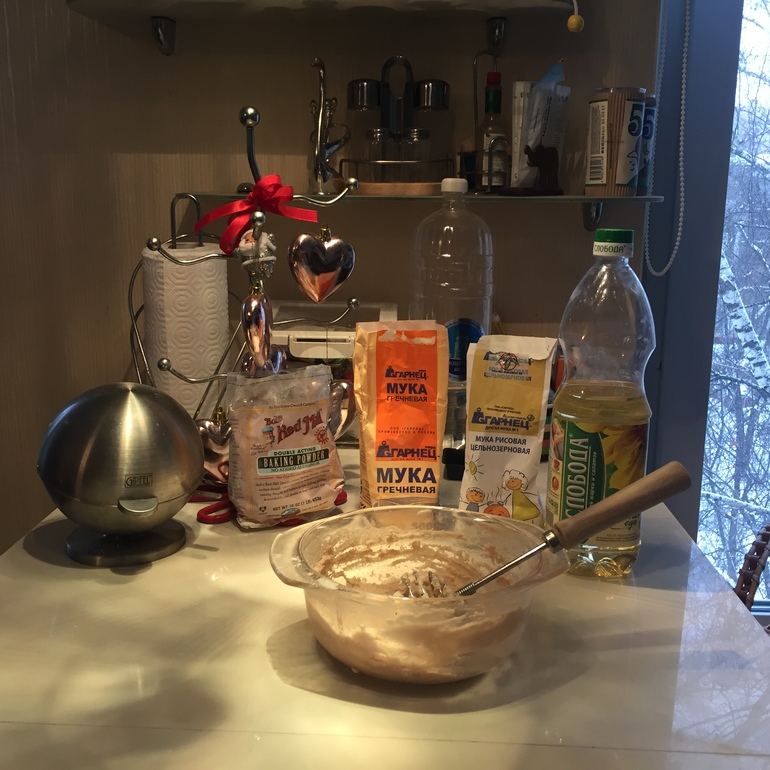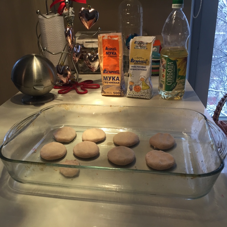 Муку гречневую, рисовую, разрыхлитель, сахар перемешать, добавить воду и раст масло (вместо яйца). Тесто должно получится густым.
