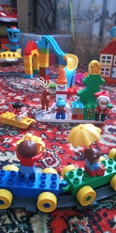 Просто катать и заправлять поезд моему трехлетке быстро наскучило и мы придумали "станции" - на каждой остановке своя тема: вокзал, аэропорт, дом, ферма (лето), зима, горка. Среди пассажиров даже присутствуют туристы с фотоаппаратом)))