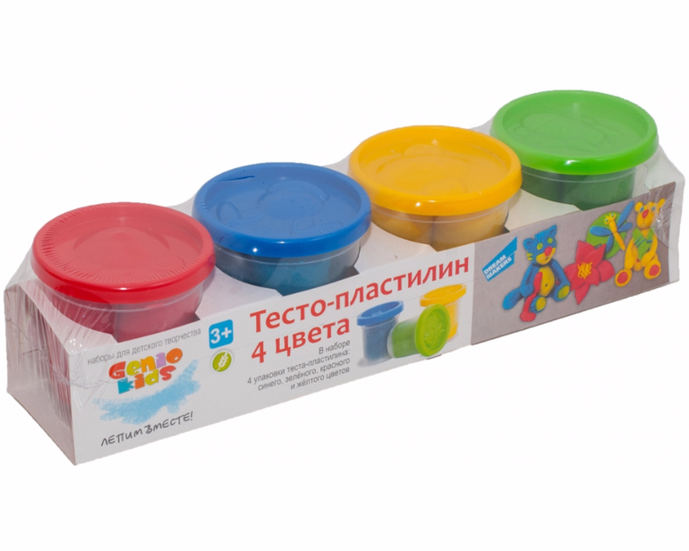 - 4.Набор для детского творчества «Тесто-пластилин 4 цвета» Genio kids. Тесто-пластилин - это натуральный и совершенно безвредный материал, созданный из пшеничной муки. Оно легко смывается и не оставляет после себя грязи.
