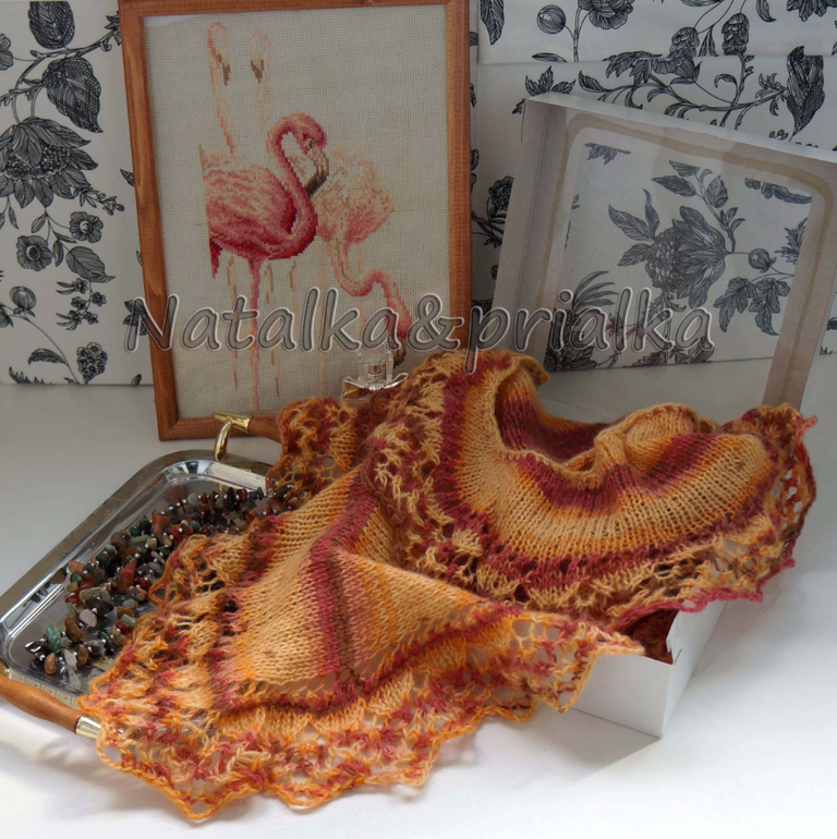 Воздушная шаль упакована в коробочку с прозрачным окошком, благодаря чему Вы сразу сможете оценить красоту расцветки и кружева.