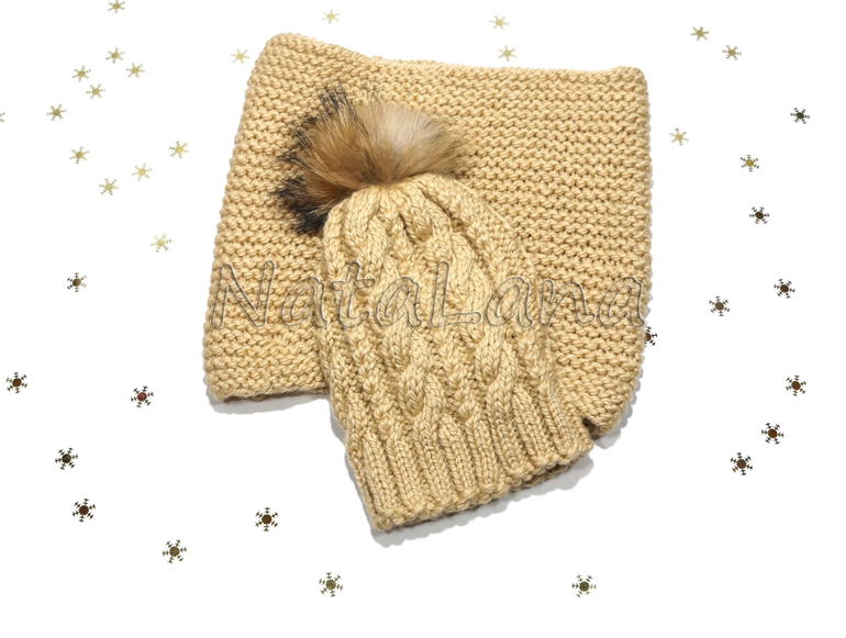 Шапка с меховым помпоном и снуд. Ручная вязка. Полушерсть. ГОТОВАЯ РАБОТА. На заказ любого цвета.