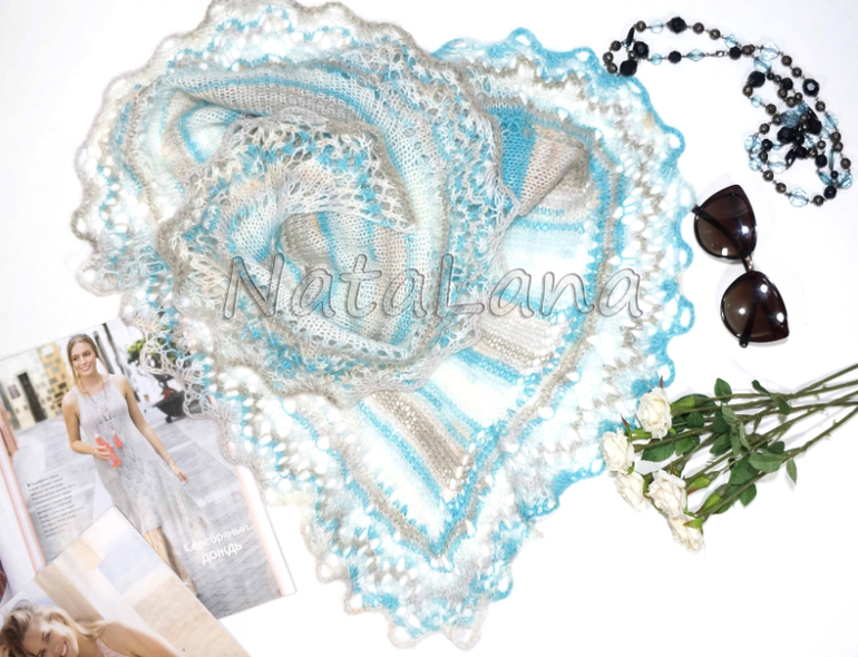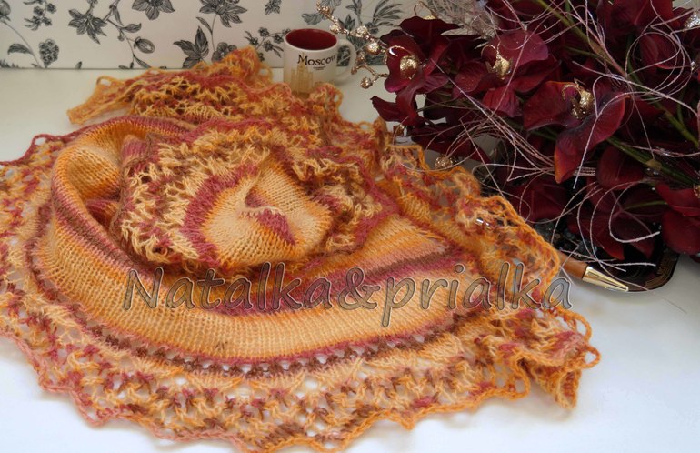 Шаль-фишю - это ассиметричная серповидная маленькая шаль. Шаль выполнена ручной вязкой и по краю украшена ажурной каймой. Оригинальные цветовые переходы получаются благодаря секционному окрашиванию пряжи.