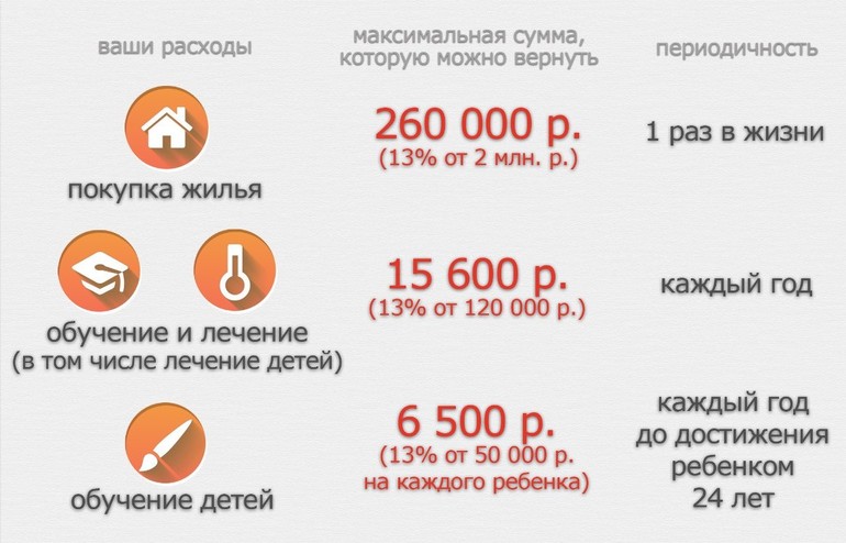 + Социальные вычеты: лечение, обучение ваше/вашего ребенка (напр., курсы, вождение, кружки, секции, платный сад); платные анализы, посещения врачей, платные роды, ДМС; страхование жизни.