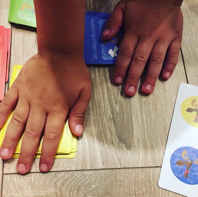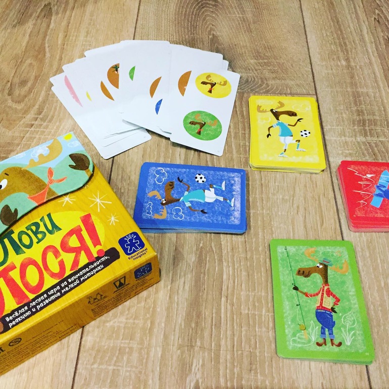 Потому что есть усложнённый вариант основных правил, который про охотников-эстетов и накопителей: там надо собирать комплекты из лосей четырёх разных цветов, чтобы победить. А третья игра - совсем самостоятельная, на тренировку памяти. В ней надо запоминать, где лежат какие лоси, и быстрее других собирать из одинаковых пары. Благодаря этому «Лови лося» вообще становится универсальной игрой для всей семьи, даже для самых маленьких.
