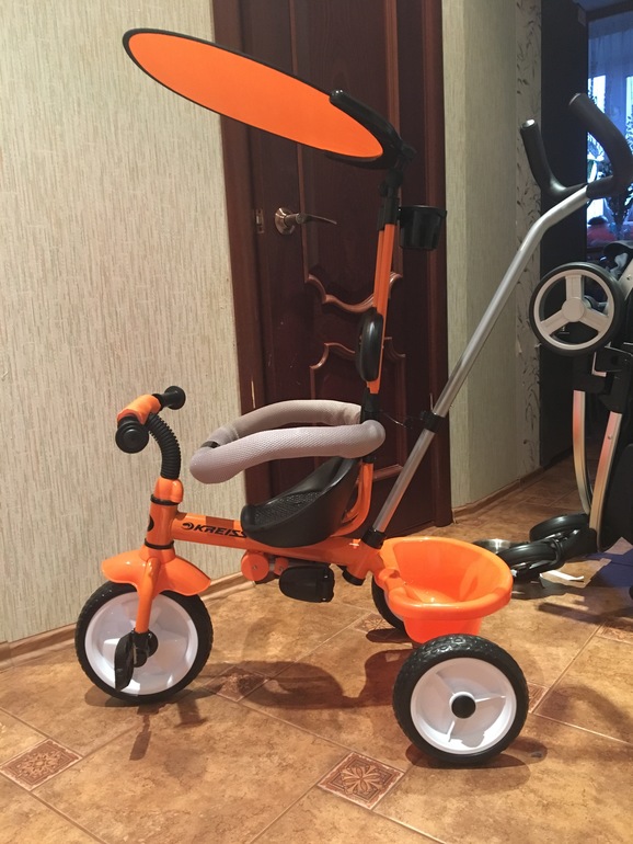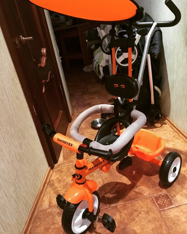 Вообще как обычно, ничего не собиралась покупать)но тут наш крестный озадачил, спросил что же подарить крестнику на др) игрушек у нас уже цееелый дом, одёжку тоже ему много чего заказала, потом сделаю пост и на одёжку к лету , как придёт) в общем полезла я на свой любимый сайт детского мира, кстати покупка коляски тоже вышла случайной, так как мы думали к лету купить сыну велосипед с ручкой для мамы)ну и я так, ради интереса, залезла в велосипеды) там я увидела 4 новых модели, точнее 2, и каждых по 2 расцветки, цена их была 3799 и 5599..мой взор упал на первый, т, к раз уже взяли коляску, то мягкое силушка (чехол) и тени большой мне уже не нужен был, а цена второго только именно за эти приблуды. С бонусами бы он вышел 3 тысячи, но подумала нет, наверное все же не нужен)потом случайно увидела мотоциклы электро, по очень вкусной скидке, об этом в следующем посту) в общем оставила я все это дело на следующий день)утром щахожу и виду, что на велосипед скидка!2999, а у нас ещё был купон электронный (я не думала что мы что-то будем покупать и 9 на чеке я выкинула балда), в общем заказала я велосипед )но в итоге и мотоцикл заказали😂 Приехали домой собрали, такой здоровенький, не хлипкий, мне очень понравился!)а за такие деньги 2499( с купоном), вообще сказка!) удобно открывается защита, по середине, и раскрывается по сторонам, удобно будет сажать и снимать ребёнка (а чехол я возможно сама сошью). Ручка тоже устойчивая, поворачивается легко!в общем я очень довольна покупкой) цвет очень яркий) был ещё зелёный, но этот больше пригляделся нам)