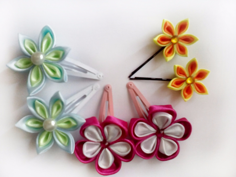 Летом познакомилась с техникой "канзаши". Красивые цветочки получаются. Можно еще с сочетанием цветов поэксперементировать.