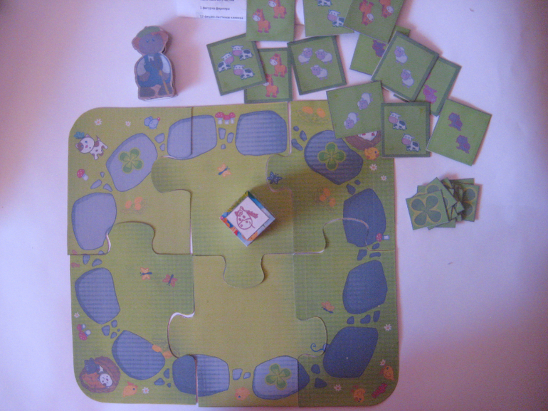 Интересная игра - и бродилка, и обучение счету, и забота о животных. Игра представляет собой поле-пазл (опять же напечатано на картоне, а хотелось бы потолще), фишек животных, фишек клевера, кубика и фигурки фермера.